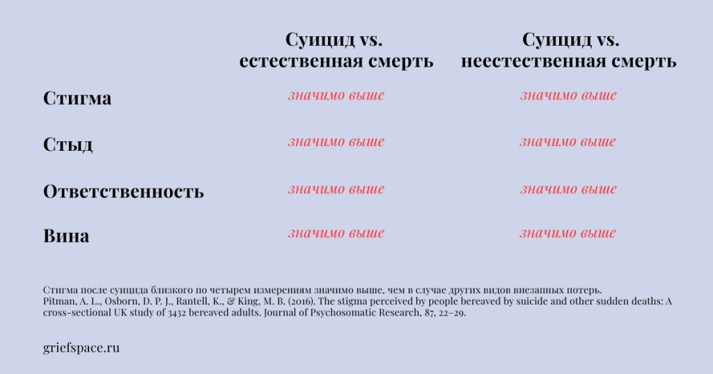 Результаты Pitman et al. (2016) согласуются с более широким списком литературы по этой теме. Обзор Tal Young и коллег (2012), упоминаемый в работе Camacho et al. (2020), показал, что люди, горюющие после суицида, испытывают более высокий уровень вины по сравнению с пережившими несчастный случай, убийство или естественную смерть. Качественное исследование Chapple, Ziebland и Hawton (2015) описало суицид как «иную смерть», окружённую табу и социальной неловкостью.